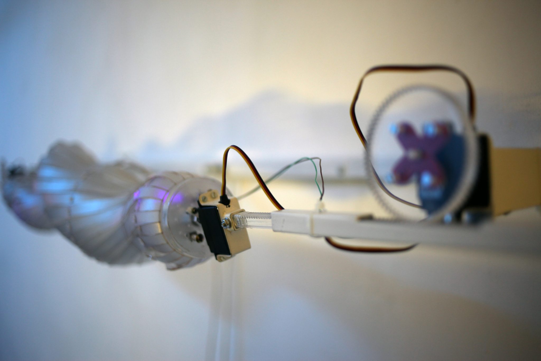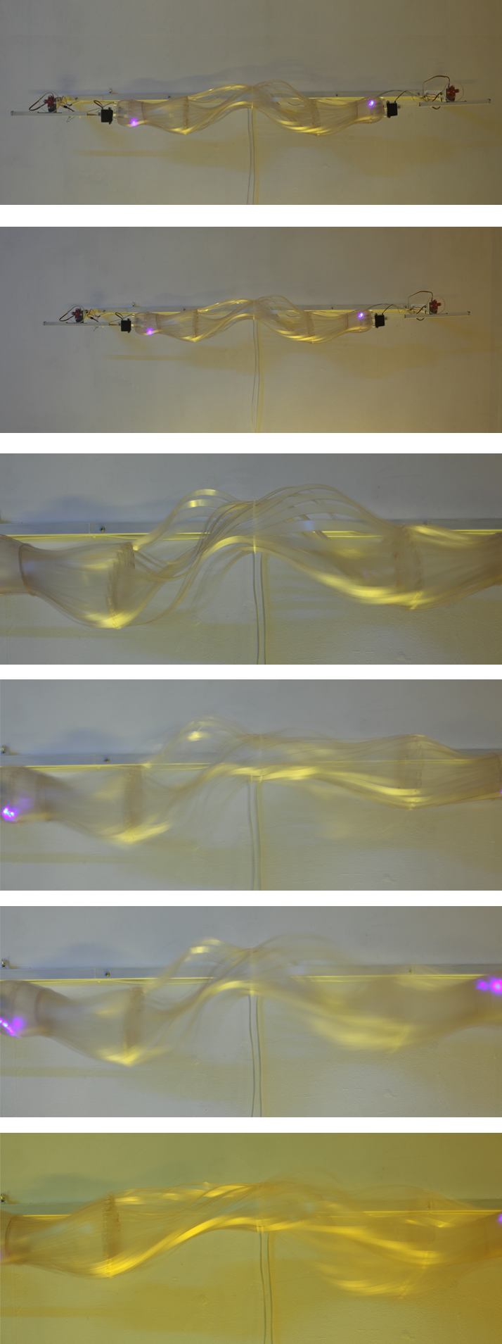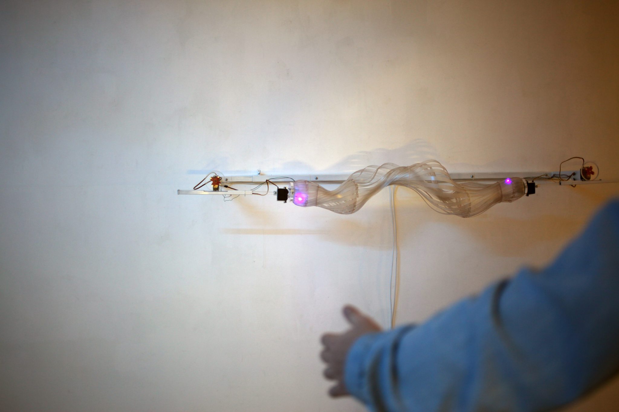 Nowadays, architecture uses a wide spectrum of digital tools and algorithmic processes in order to create spatial and designing complexity. Through coding and programming, architects have the ability to design complex forms that they could not produce without the “help” of digital software. But, how feasible is the construction of these new, complex, digital forms? The installation investigates the gap between physical and digital world and it presents an approach to bridge them by using the human body as an interface for creating spatial interaction. While in front of a computer’s screen the possibilities of interacting and then designing seem endless, the installation investigates whether digital design and interaction implemented in the real/physical world as a spatial device lower these possibilities. Thus, the team -which consists of digital programmers and physical makers- with this experiment gives the opportunity to the user to compare the two different worlds and raises the issue of how the two worlds in architecture should be complementary and learn from each other. As an analogy to human’s perception of stimuli that makes him react with a complex system of nerve endings, the user through the installation “produces” stimuli that cause reaction of a mechanism that simulates the human muscles. The installation uses a simple cylindrical form which consists of several stripes -as an The installation uses a simple cylindrical form which consists of several stripes -as an analogy to human’s nerves. In the digital world the simulation investigates the form as a free mesh with multiple control points, giving the opportunity of moving/transforming it in real time, presumed upon the new technology of leap motion. In the physical world the user can control it by two different points with his hands, using the arduino board and 4 servos in order to control variables such as distance, rotation and speed.