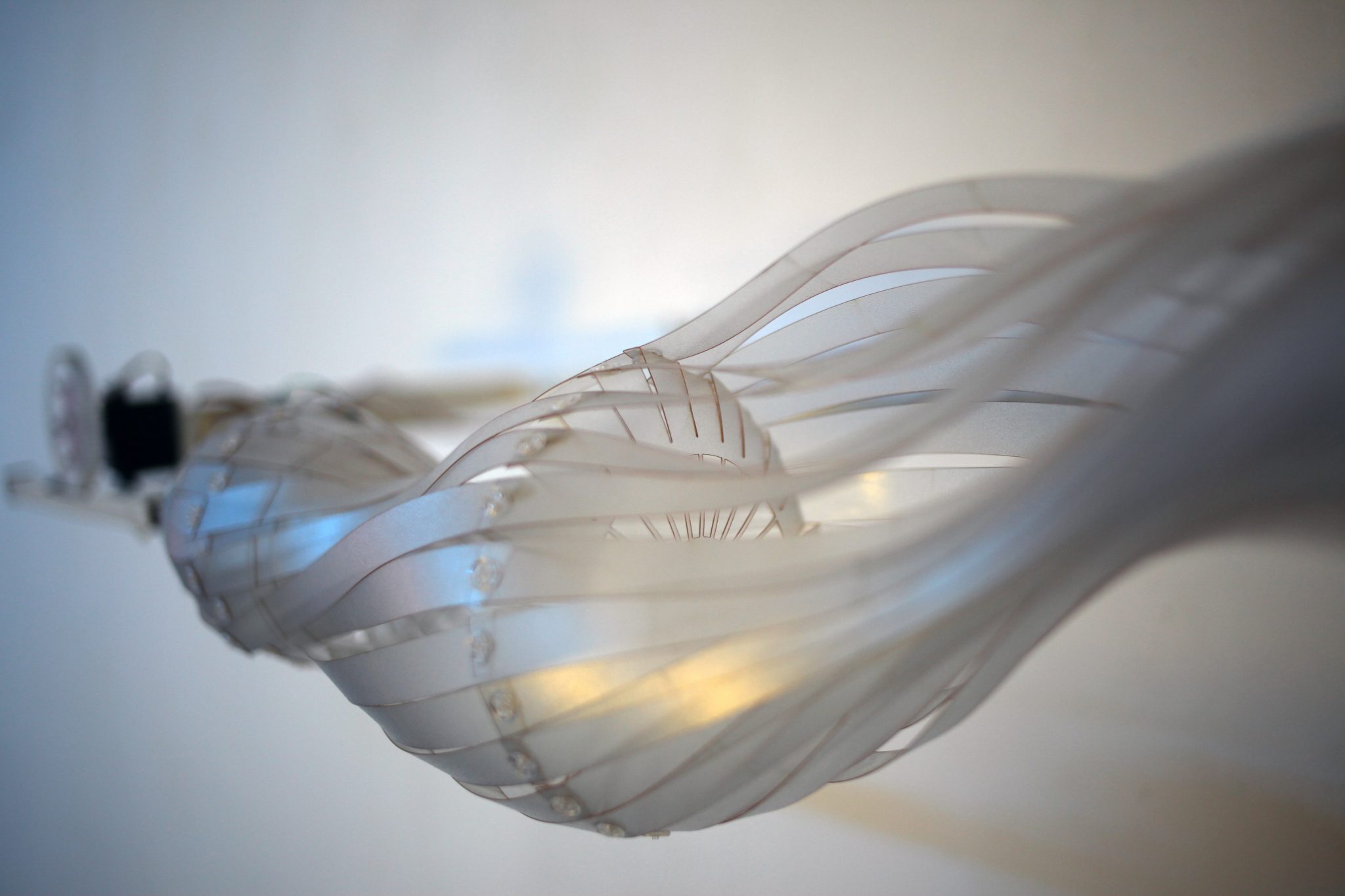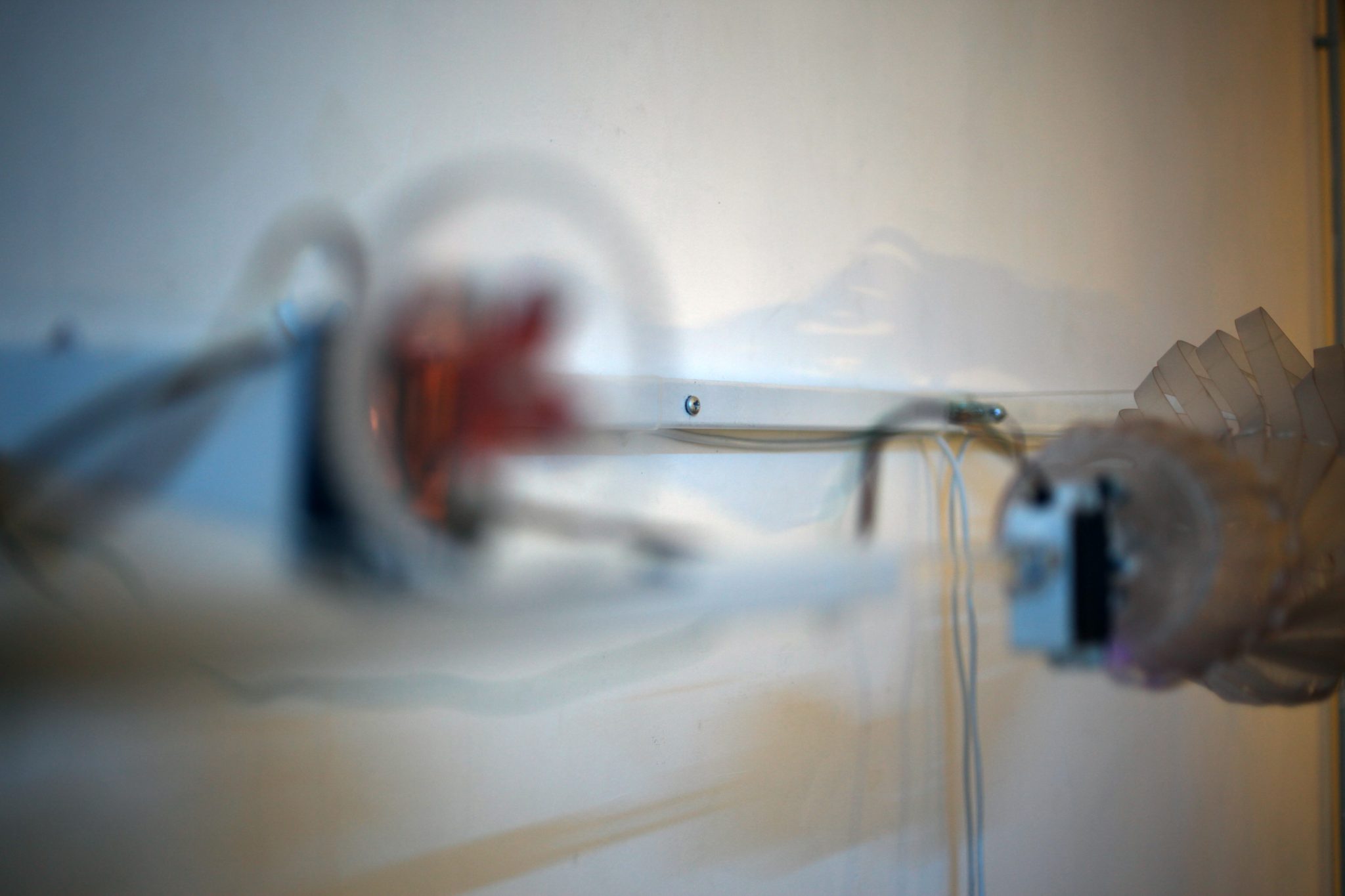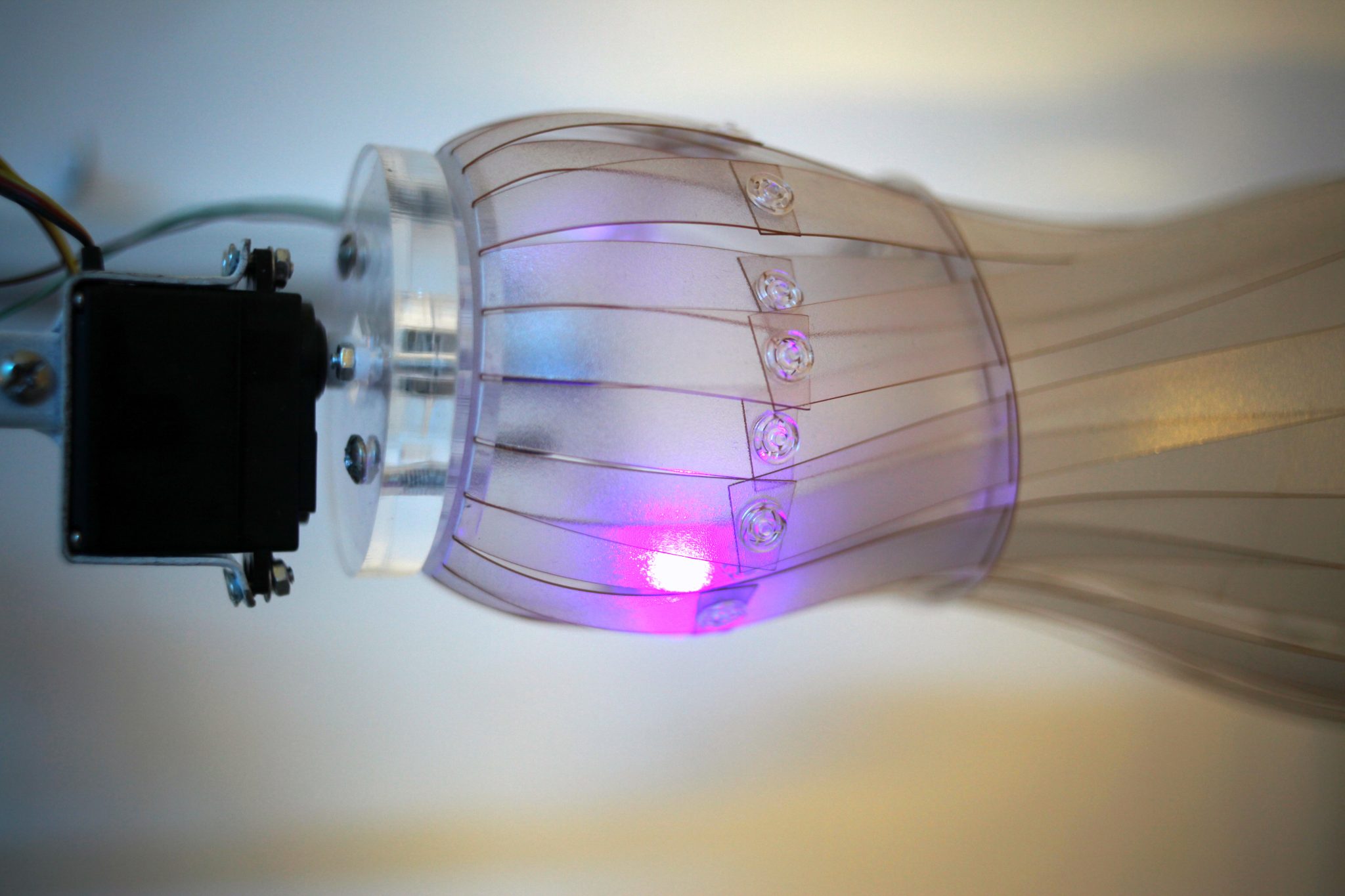 Nowadays, architecture uses a wide spectrum of digital tools and algorithmic processes in order to create spatial and designing complexity. Through coding and programming, architects have the ability to design complex forms that they could not produce without the “help” of digital software. But, how feasible is the construction of these new, complex, digital forms? The installation investigates the gap between physical and digital world and it presents an approach to bridge them by using the human body as an interface for creating spatial interaction. While in front of a computer’s screen the possibilities of interacting and then designing seem endless, the installation investigates whether digital design and interaction implemented in the real/physical world as a spatial device lower these possibilities. Thus, the team -which consists of digital programmers and physical makers- with this experiment gives the opportunity to the user to compare the two different worlds and raises the issue of how the two worlds in architecture should be complementary and learn from each other. As an analogy to human’s perception of stimuli that makes him react with a complex system of nerve endings, the user through the installation “produces” stimuli that cause reaction of a mechanism that simulates the human muscles. The installation uses a simple cylindrical form which consists of several stripes -as an The installation uses a simple cylindrical form which consists of several stripes -as an analogy to human’s nerves. In the digital world the simulation investigates the form as a free mesh with multiple control points, giving the opportunity of moving/transforming it in real time, presumed upon the new technology of leap motion. In the physical world the user can control it by two different points with his hands, using the arduino board and 4 servos in order to control variables such as distance, rotation and speed.